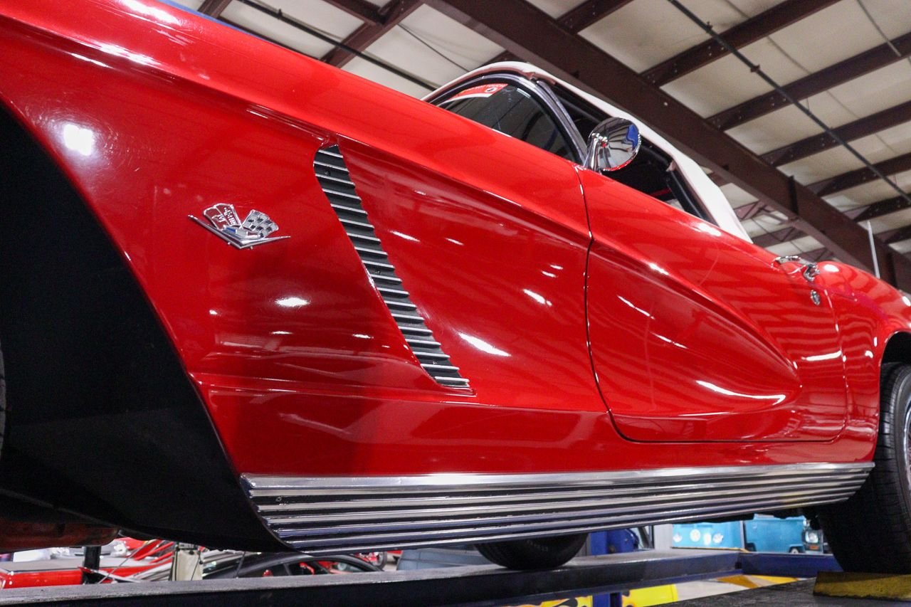 At first glance, the 1962 Corvette showcases a sleek and aerodynamic body, characterized by smooth lines and a low-slung profile. Its curvaceous shape is complemented by a long hood, flared fenders, and a distinctive dual-cove design on the sides, adding a touch of elegance and aggression. The car’s overall aesthetic exudes timeless charm, combining classic elements with a hint of modernity.