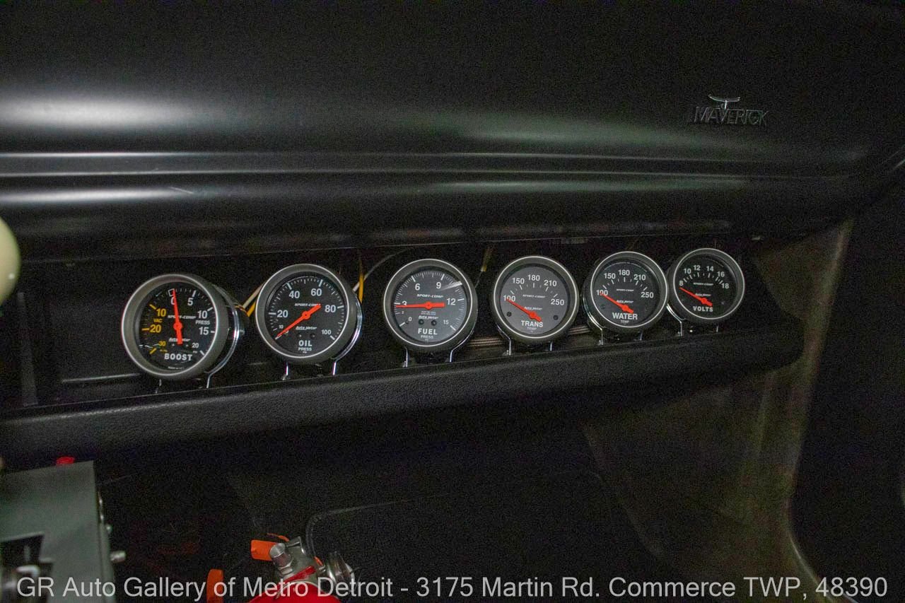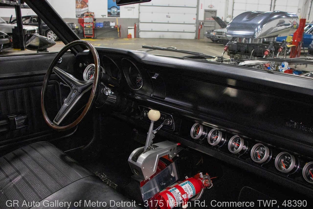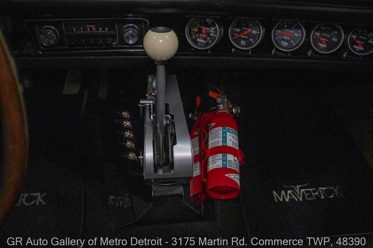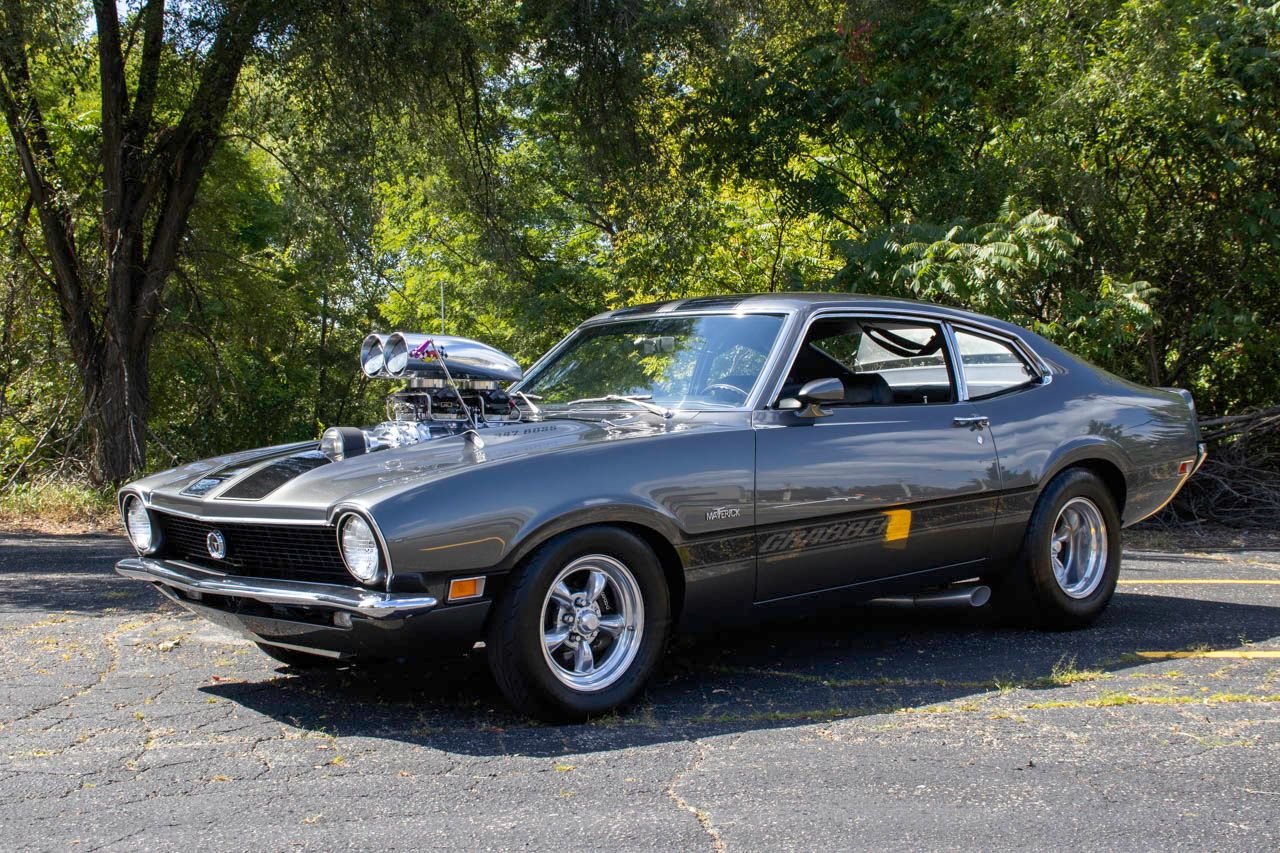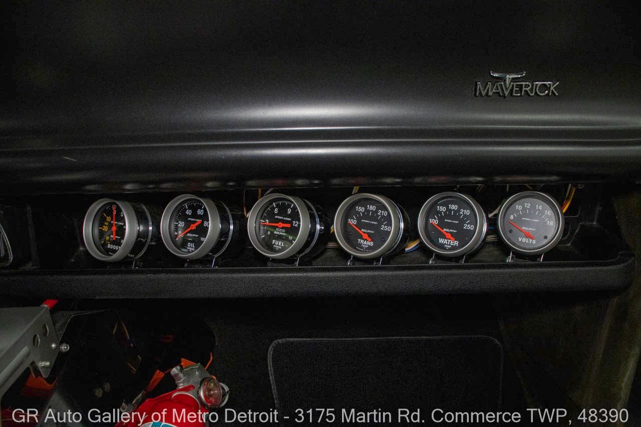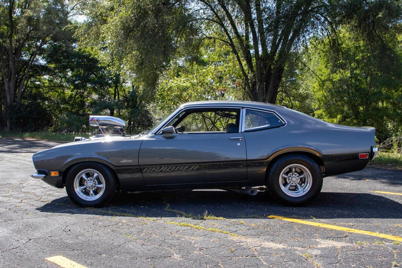 1970 Ford Maverick, a true powerhouse boasting a supercharged 347 cubic inch stroker V8 that delivers an exhilarating 750 horsepower. This Maverick showcases an eye-catching Grabber Gray Metallic finish with painted black stripes, perfectly complemented by a sleek black interior. With just 23,513 original miles on the odometer, this well-maintained classic features a C4 3-speed automatic transmission and is geared with a 9-inch rear end. Notable upgrades include custom-fabricated sheet metal, original wipers, interior and windows, a Hurst quarter stick shifter, aftermarket Auto Meter gauges, and an RPM shift indicator gauge. Repainted in 2013, this Maverick is set for performance with a BDS blower that runs on 110 racing fuel, achieving an astonishing 9.9-second quarter mile. The ride is further enhanced by Mickey Thompson tires, Wilwood disc brakes, American Racing wheels, and a distinctive side exit exhaust system. Drive this one out of our showroom or have us assist with shipping it to you anywhere in the United States! Don’t hesitate to call us with any questions or for more information.