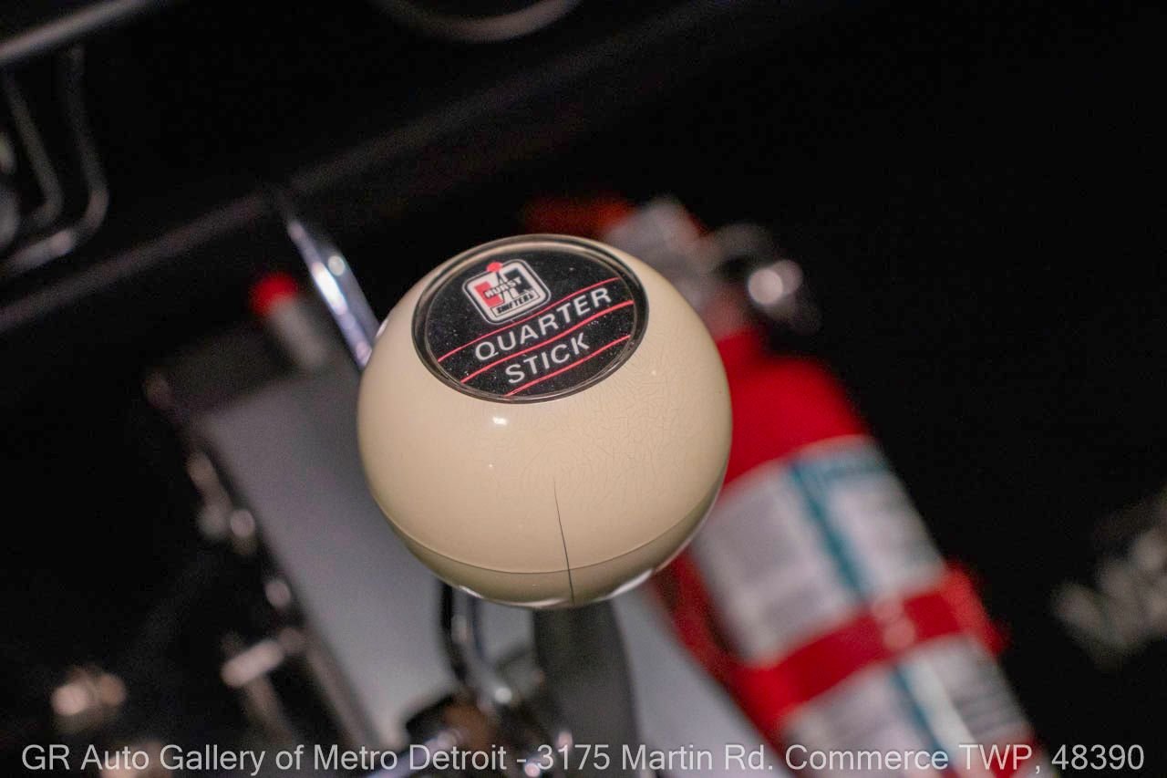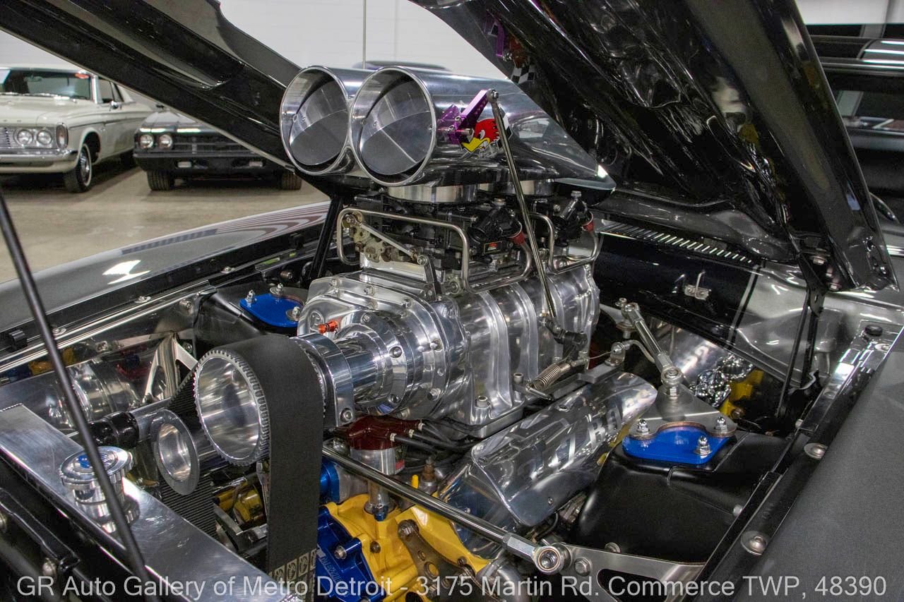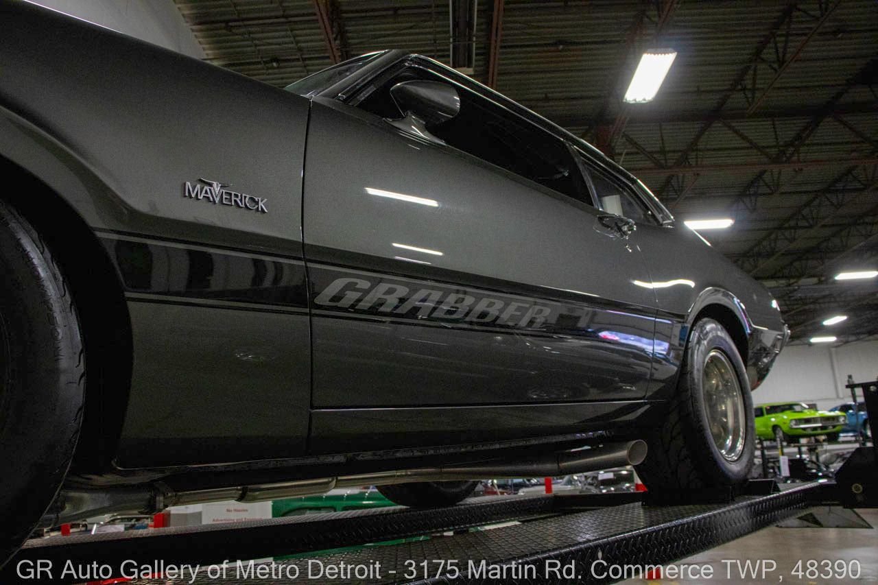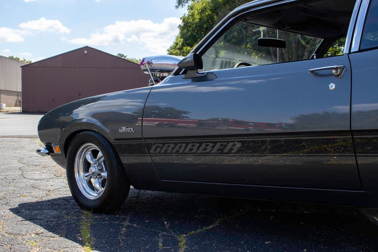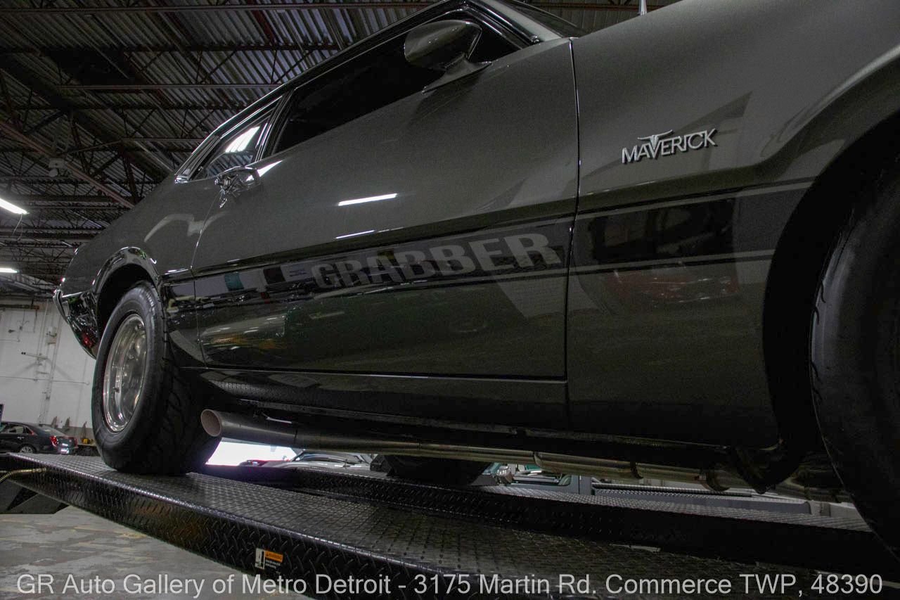 1970 Ford Maverick, a true powerhouse boasting a supercharged 347 cubic inch stroker V8 that delivers an exhilarating 750 horsepower. This Maverick showcases an eye-catching Grabber Gray Metallic finish with painted black stripes, perfectly complemented by a sleek black interior. With just 23,513 original miles on the odometer, this well-maintained classic features a C4 3-speed automatic transmission and is geared with a 9-inch rear end. Notable upgrades include custom-fabricated sheet metal, original wipers, interior and windows, a Hurst quarter stick shifter, aftermarket Auto Meter gauges, and an RPM shift indicator gauge. Repainted in 2013, this Maverick is set for performance with a BDS blower that runs on 110 racing fuel, achieving an astonishing 9.9-second quarter mile. The ride is further enhanced by Mickey Thompson tires, Wilwood disc brakes, American Racing wheels, and a distinctive side exit exhaust system. Drive this one out of our showroom or have us assist with shipping it to you anywhere in the United States! Don’t hesitate to call us with any questions or for more information.