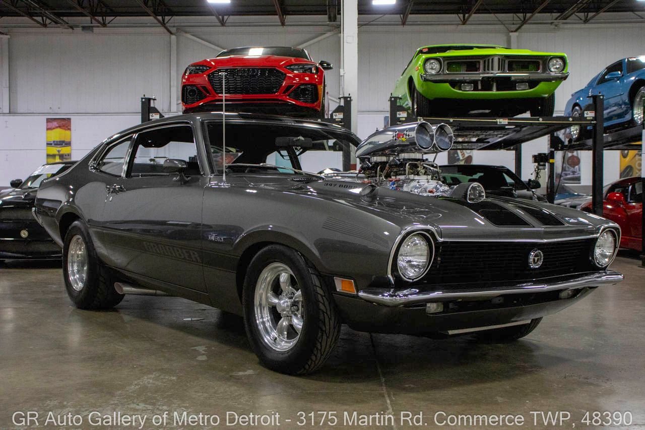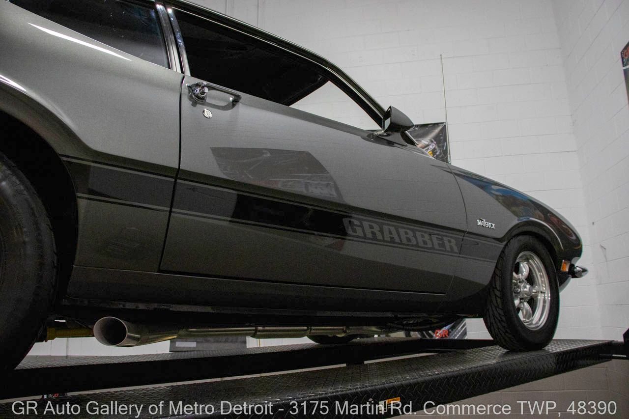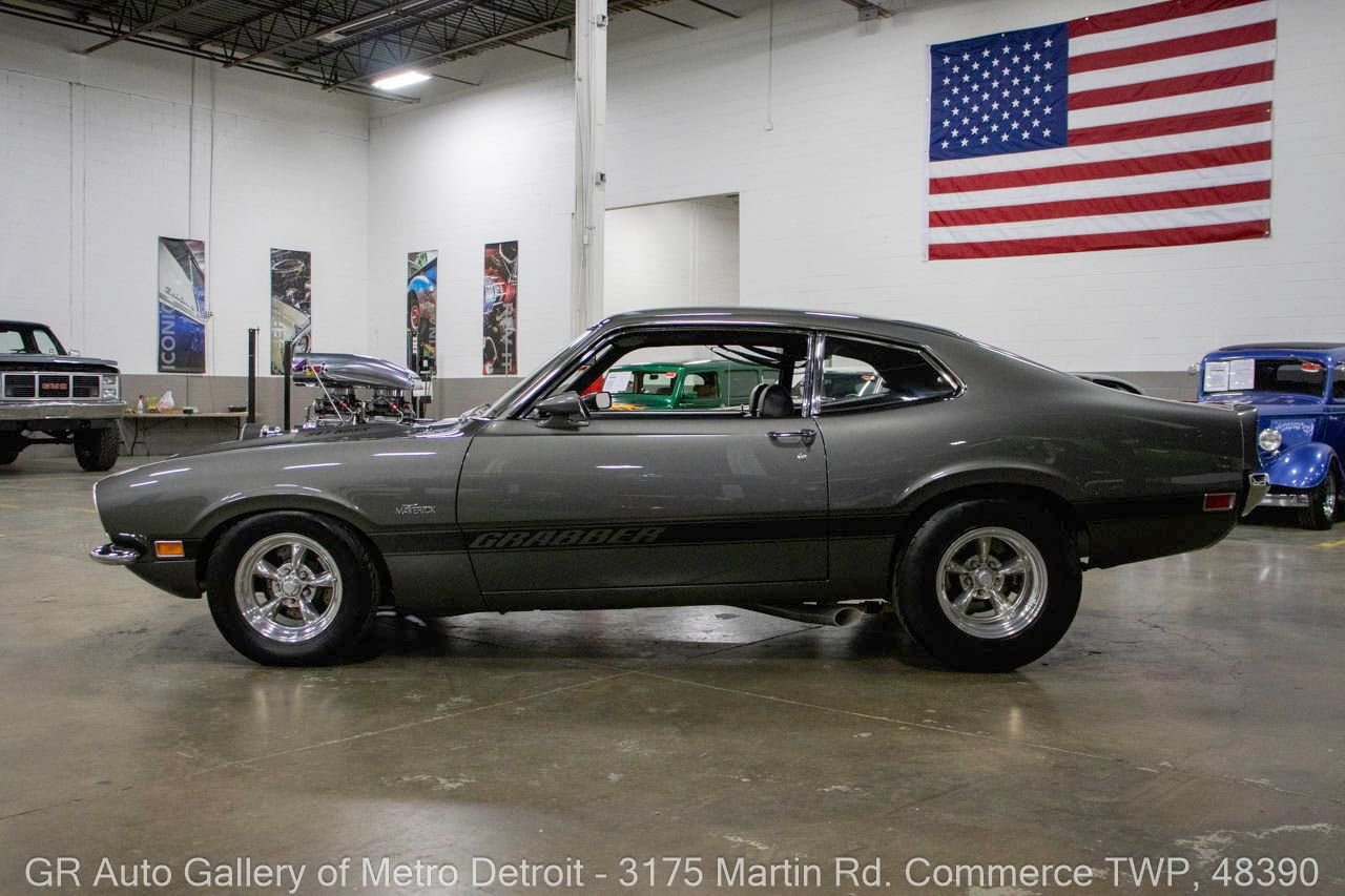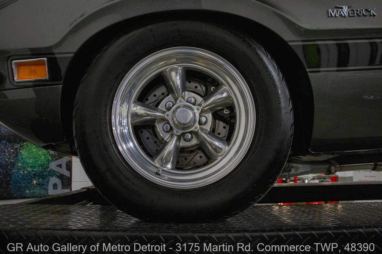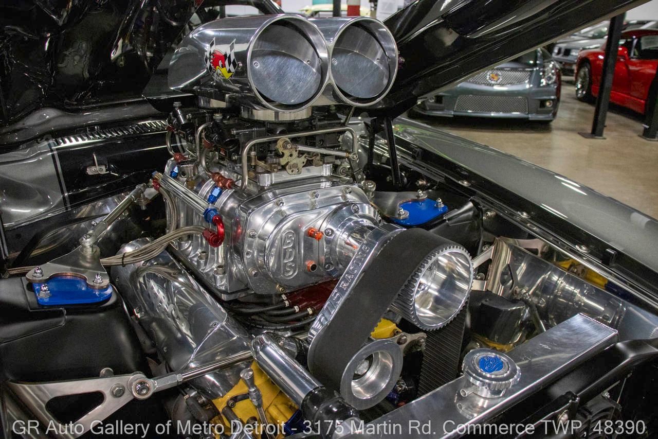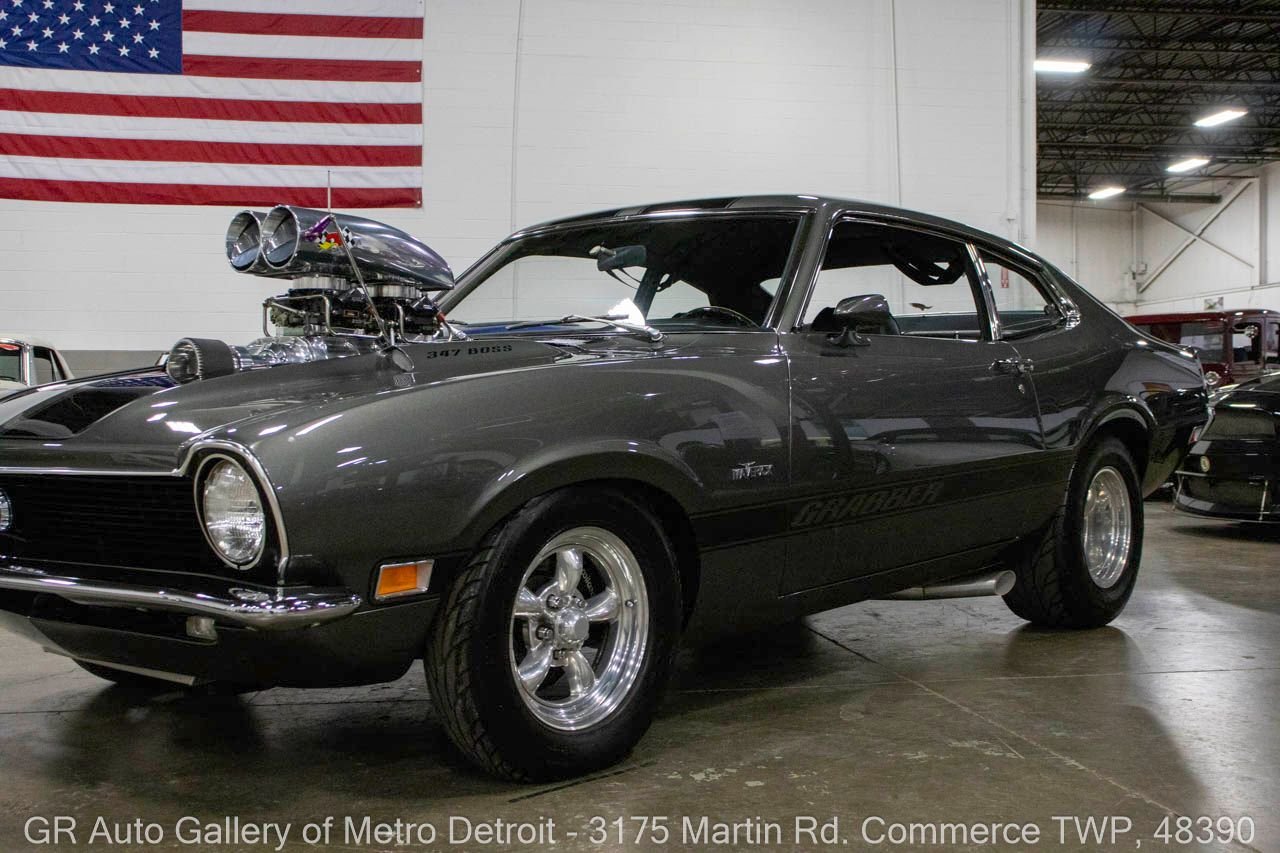 1970 Ford Maverick, a true powerhouse boasting a supercharged 347 cubic inch stroker V8 that delivers an exhilarating 750 horsepower. This Maverick showcases an eye-catching Grabber Gray Metallic finish with painted black stripes, perfectly complemented by a sleek black interior. With just 23,513 original miles on the odometer, this well-maintained classic features a C4 3-speed automatic transmission and is geared with a 9-inch rear end. Notable upgrades include custom-fabricated sheet metal, original wipers, interior and windows, a Hurst quarter stick shifter, aftermarket Auto Meter gauges, and an RPM shift indicator gauge. Repainted in 2013, this Maverick is set for performance with a BDS blower that runs on 110 racing fuel, achieving an astonishing 9.9-second quarter mile. The ride is further enhanced by Mickey Thompson tires, Wilwood disc brakes, American Racing wheels, and a distinctive side exit exhaust system. Drive this one out of our showroom or have us assist with shipping it to you anywhere in the United States! Don’t hesitate to call us with any questions or for more information.
