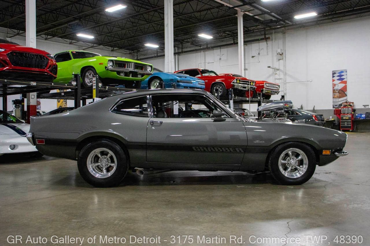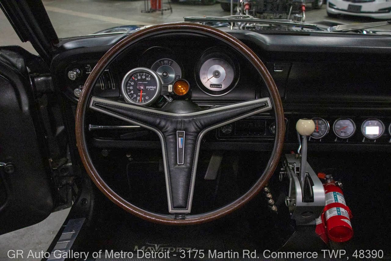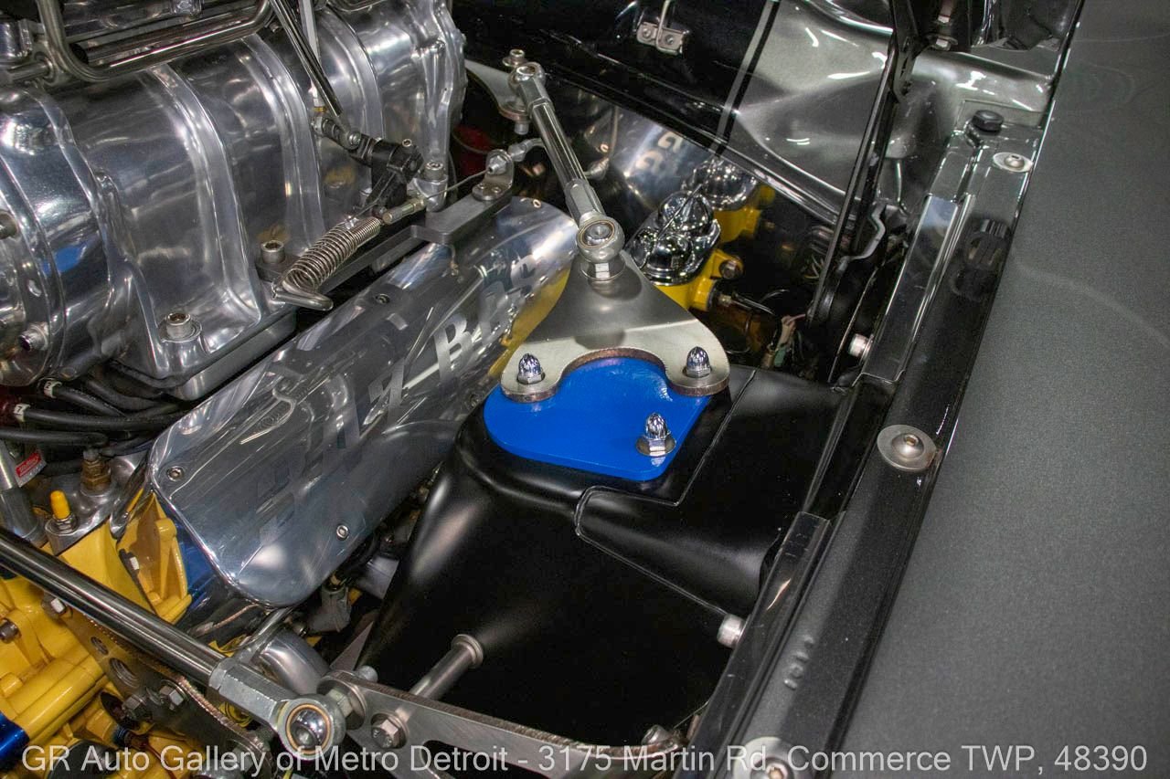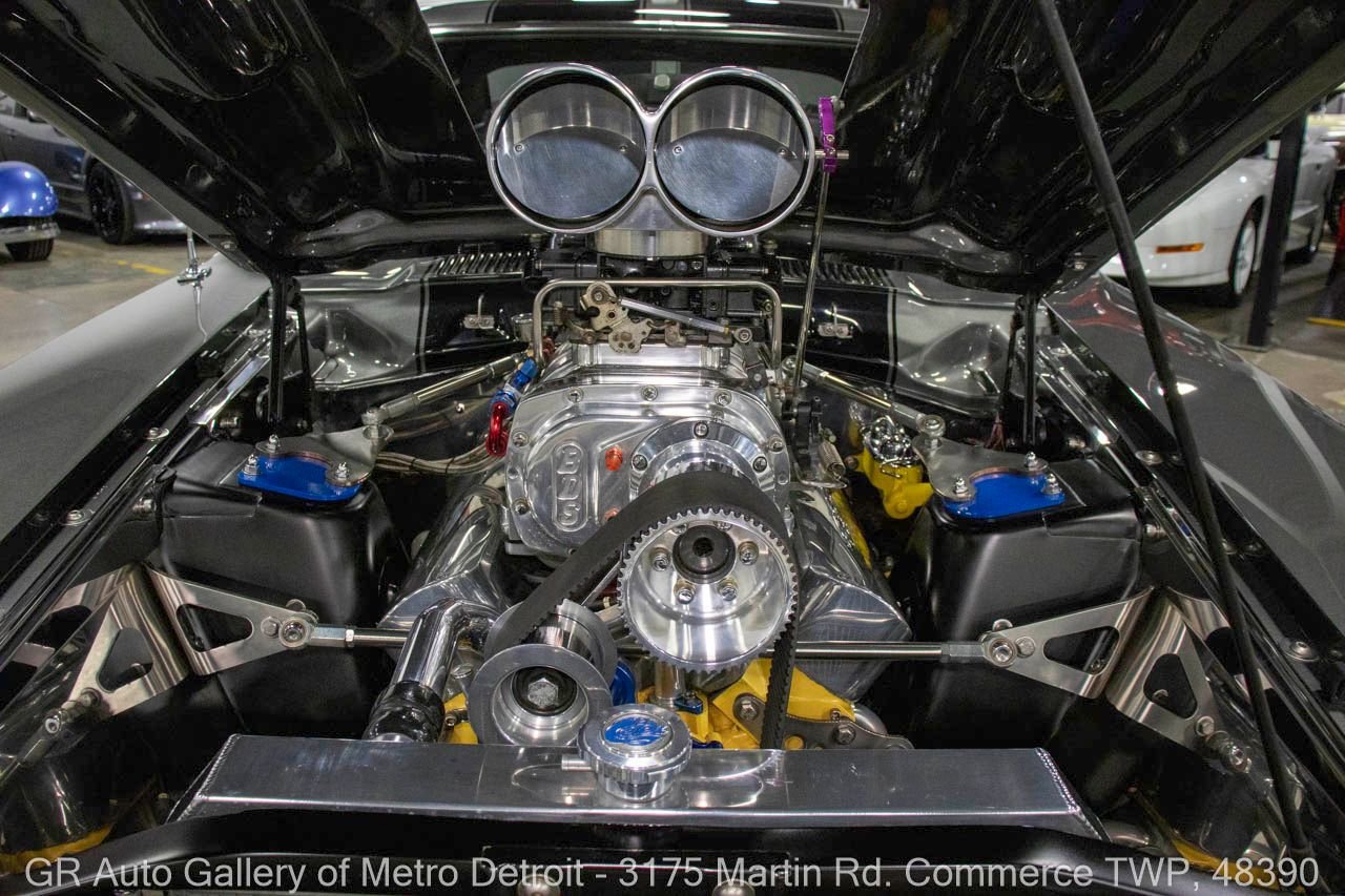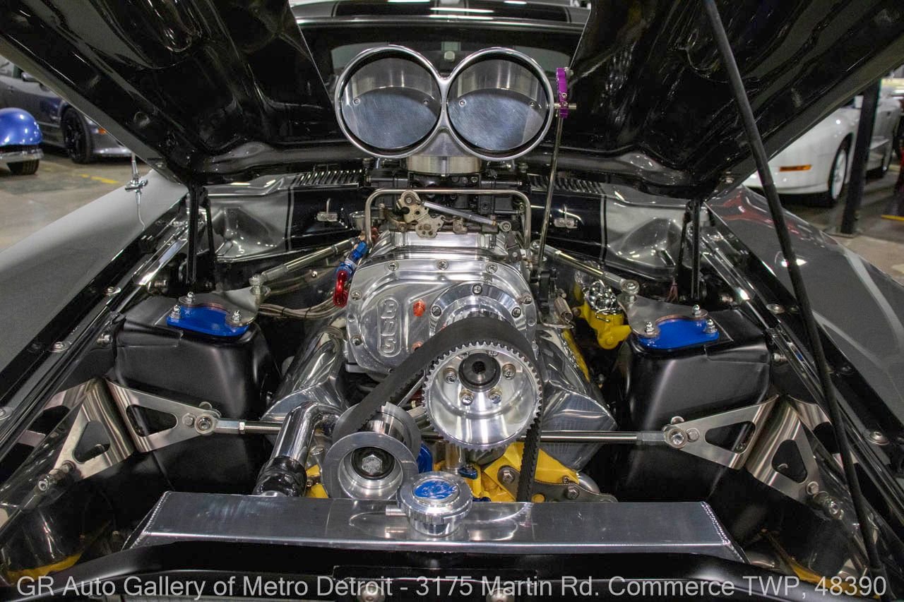 1970 Ford Maverick, a true powerhouse boasting a supercharged 347 cubic inch stroker V8 that delivers an exhilarating 750 horsepower. This Maverick showcases an eye-catching Grabber Gray Metallic finish with painted black stripes, perfectly complemented by a sleek black interior. With just 23,513 original miles on the odometer, this well-maintained classic features a C4 3-speed automatic transmission and is geared with a 9-inch rear end. Notable upgrades include custom-fabricated sheet metal, original wipers, interior and windows, a Hurst quarter stick shifter, aftermarket Auto Meter gauges, and an RPM shift indicator gauge. Repainted in 2013, this Maverick is set for performance with a BDS blower that runs on 110 racing fuel, achieving an astonishing 9.9-second quarter mile. The ride is further enhanced by Mickey Thompson tires, Wilwood disc brakes, American Racing wheels, and a distinctive side exit exhaust system. Drive this one out of our showroom or have us assist with shipping it to you anywhere in the United States! Don’t hesitate to call us with any questions or for more information.